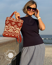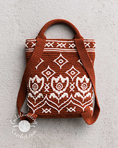 * Yarn1 (background): 265g (with 10% extra) in 388 Rust, including 23g for bottom, 135g for body, 26g for upper edge backing, 14g for the first handle, 66g for backpack straps/second handle)