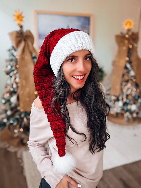 Feeling extra whimsical? Create elf-inspired stripes by switching colors every two rounds for that iconic North Pole look! Prefer to channel Santa himself? Keep it simple with a solid red version for a classic Christmas vibe. Easy shaping and gradual decreases create the long, pointed stocking-cap silhouette everyone loves. Finish it all off with a fluffy pompom for the perfect festive flourish.