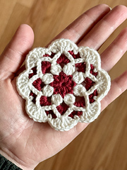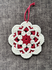 The ornament is a snowflake inspired mandala design worked in 2 colors - I love the white and red, but feel free to experiment with other color combos. It also looks beautiful in all white or cream.