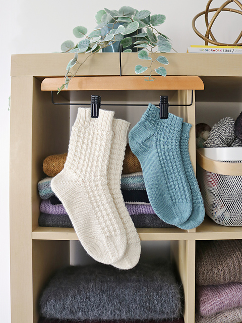 Samples shown in Hobbii Unicorn Solid in Sea Foam and Knit Picks Hawthorne DK bare yarn.