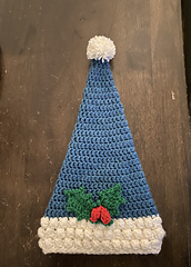 Hat is worked from the peak toward the brim in one piece. Pompom and holly leaf motif made separately.