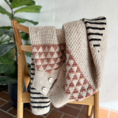 The jacket is worked top-down. First, stitches are cast on at the back of the neck and worked back and forth in stripes with increases for the shoulders. When the shoulders have reached their final width, double moss stitch is worked on the back until the armhole depth is reached. At the same time, a small triangle pattern in intarsia is formed in the center of the back.
