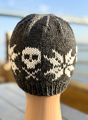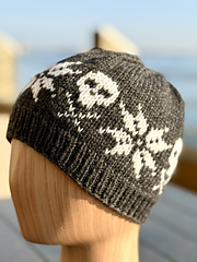 Dead Cold is a simple, stranded colorwork hat featuring a snowflake and a small skull motif — a little wintery, a little moody, and an approachable knit for anyone comfortable working with two colors in the round. The hat is worked from the brim up with 1×1 ribbing, followed by the colorwork section and a smooth, straightforward crown decrease. It’s a quick knit and works well in high-contrast worsted-weight yarn.