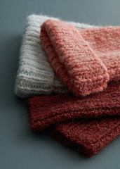 - 1 (1, 2) ball(s) of Purl Soho’s [Pouf][1], 50% alpaca and 50% Andean highland wool. Each ball of this super bulky-weight yarn is 108 yards/ 100 grams; approximately 75 (100, 125) total yards required. We used Pink Bisque, Pearl Blue, and Twig Brown.