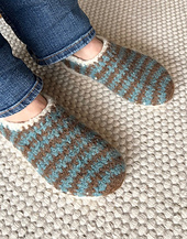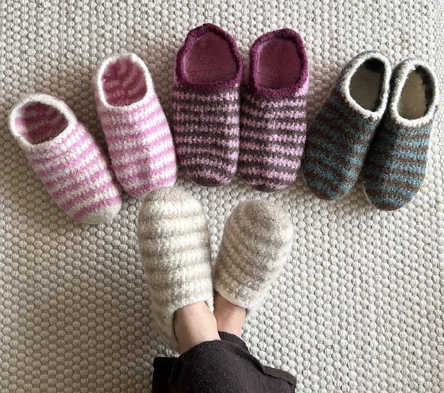 After crocheting, the slippers are felted in the washing machine at 40°C. The final size can be adjusted by increasing or shortening the wash cycle.