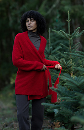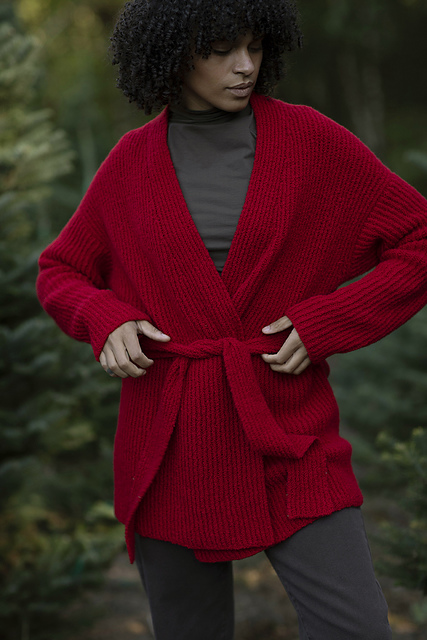 is worked first, then back stitches are picked up along the back collar edge, and worked flat to the underarm, with shoulder and underarm increases. Front stitches are picked up along the shoulder's edge and collar live stitches, and worked flat to the underarm with collar worked simultaneously. After fronts are worked to the underarm, back and fronts will be joined and the body is worked flat to hem. Sleeves are picked up around each armhole and worked in the round to the cuff. Finally the belt