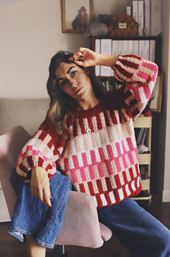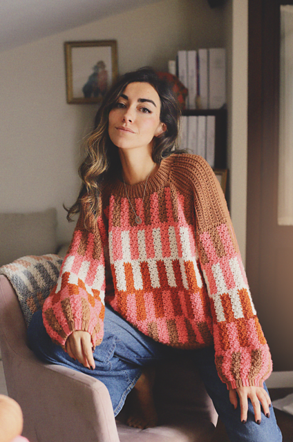 The Pixel Pullover is crocheted with the Fair Isle technique. This is the main feature of the design: its colors and intertwined geometric shapes. This unique technique plays with color changes by using two (or more) colors in the same round but only working with one at a time. The colors you're not using just float along the back instead of being carried inside the stitches as in Tapestry, which prevents additional bulk in the finished texture.