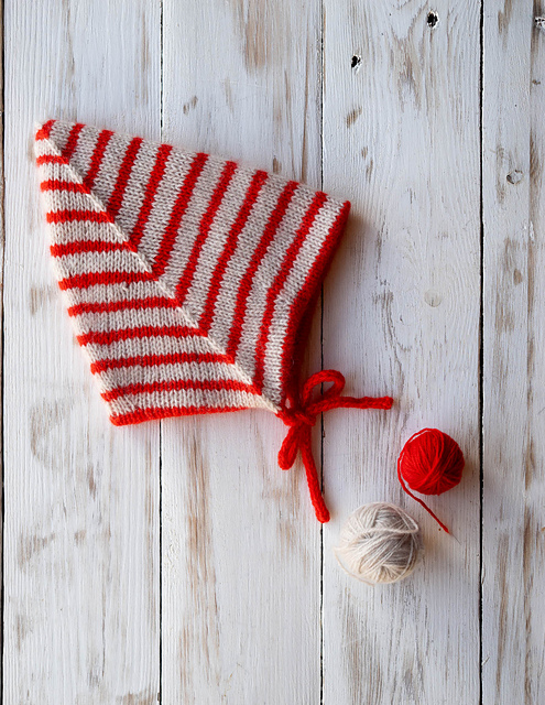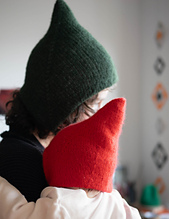 Just like the popular Musselburgh Hat the Elf-burgh bonnet is knit from the tip of one crown to the other as a long tube. When you’re done simply turn one layer inside the other to create the cosy, double layered bonnet that perfectly hugs the head. Knit each side in different colours and you have two hats in one, it’s fully reversible with a perfectly clean finish on both sides. The cleverly shaped pointed crown and earflaps are worked entirely with simple increases and decreases. Stripes and self-striping yarn work particularly well, highlighting the chevron shaping on the earflaps.