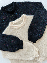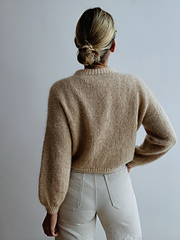 The sweater is worked top down in stockinette stitch in one piece: First, the back part is worked back and forth in rows. The shoulder section is shaped with German Short Rows for the best fit possible. Afterwards, the front panels are shaped separately at first to form the round neck with increases. Then, the front parts are joined along the round neck and the front part is finished in one piece. Now, the front part and the back part are joined by casting on new stitches under the armpits. The body of the sweater is now worked in stockinette stitch in the round and finished off with a hem in 1x1 ribbing. The sleeves are then worked along the armholes. Therefore, pick up stitches along the armholes and work the sleeves in stockinette stitch in the round shortly before the wrists. Before working the cuffs in 1x1 ribbing, work a bunch of decreases for a slightly balloon-like sleeve shape. Now finish off the sleeve with cuffs in 1x1 ribbing. Last but not least the round neck is finished off with a double folded collar in 1x1 ribbing as well.