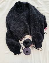 The sweater has a classic fit and a straight cut. The simplicity of the design contrasts with a special yarn choice: The body and the sleeves are worked with 2 strands of Silk Mohair and with a thread with colourful sequins to make the sweater as unique as possible. To emphasize the contrast, collar, cuffs and hem are worked in different yarn quality to let the sequins and the fluffy silk mohair yarn shine even more.