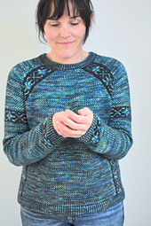Ten Mile Bay is a top down compound raglan, evoking the feel of [Joe Batt's Arm](/patterns/library/joe-batts-arm). This Ten Mile Bay raglan is worked top down and in the round, and the colorwork is ordinary stranded knitting using 2 colours. A little bit of Front neck shaping is done at the very start with the stranded colorwork worked flat for 6 rows, then you join at the Front neck and the remaining sweater is worked in the round. Compound raglan increases are made through the yoke to the underarm. Sleeve and Body stitches are divided, sleeve stitches are placed on hold, and the Lower Body is worked in the round down to the hem. Stitches around the neck are picked up and the neckband is worked in the round. Lastly, sleeves are worked down to the cuffs. The neckband, cuffs, and hem feature a 2 colour stranded garter stitch, cohesively enhancing the aesthetic of Ten Mile Bay.