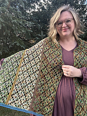 For the fingering weight pattern, finished shawl measures 78” long x 23” wide. Yardages for fingering weight shawl: 390 yards for C1, 60 yards for C2, 360 yards for C3, 60 yards for C4, 390 yards for C5, 45 yards for C6.
