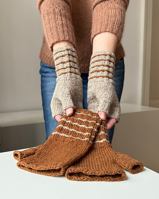 **Toffee Mitts** are simple mitts in Stockinette stitch, featuring a ribbed cuff with stripes. The mitts are easy and quick to work – perfect for a last-minute gift.