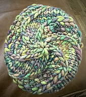 This calls for one skein of super bulky weight yarn and looks great in solids, tonal, or variegated yarns.