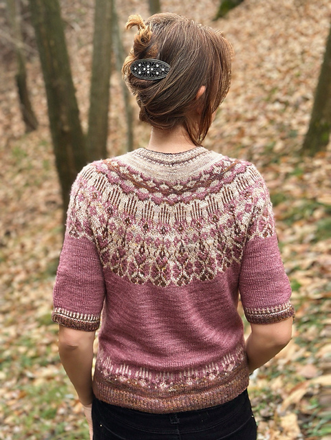 Alhambra It is an elegant yet versatile garment, embellished with refined 3-colour motifs made with the stranded technique and embellished with the beautiful melange shades of the hand-dyed yarn.