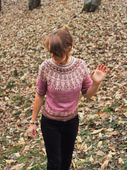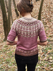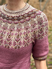 The yoke features alternating floral and geometric designs using the stranded knititing technique (3 threads per row)
