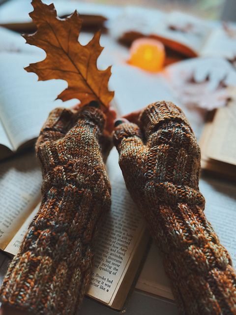 **Book Lover’s Mitts DK** is the pattern that can be worked with fingering weight yarn held double for beautiful marled effect, or with DK weight yarn. Variation with the folded top gives a warmer option for those cold and windy days when your fingers need extra warmth.