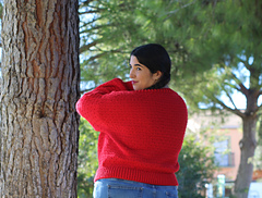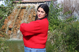 1(2,3,4)(5,6,7)(8,9) equivalentes a 81.9 (91.9, 100.0, 109.4)(117.5, 121.9, 132.5)(138.1, 146.9) cm de contorno de pecho en prenda terminada y 40 (42.5, 45, 47.5)(50, 52.5, 55)(57.5, 60) cm de contorno de manga. La prenda está calculada para llevarla con unos 8-10cm de holgura positiva, pero puedes hacer la talla que más se ajuste a tus gustos, con más holgura o menos.