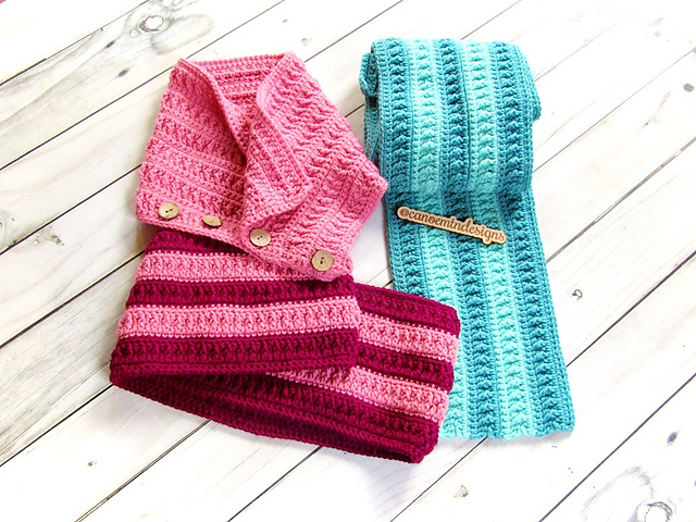 Patterns for a button cowl, infinity scarf and regular scarf. Great unisex designs with lots of texture. Crochet each or the projects in stripes or a solid color.