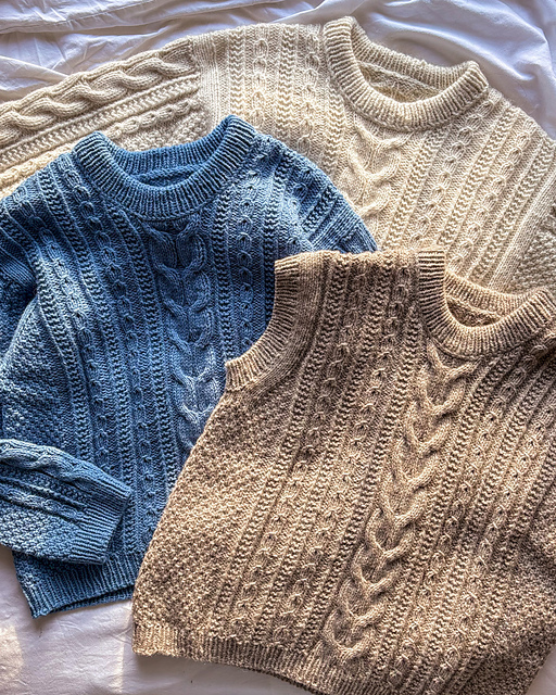 **Yarn:** For Sample 1, I used The Raw Wool Company Soft As Sea Mist DK (70% British Romney Lamb & 30% British Dorset; 100 g = 220 m / 249 yds). For Sample 2, I used Knitting for Olive Heavy Merino / 100% merino wool; 50 g = 125 m / 137 yds) in the shade Dove Blue. For Sample 3 (modified to be a vest), I used Middle Campscott Farm Organic Shetland DK Wool (100% wool; 50 g = 110 m / 120 yds in the shade Fawn.