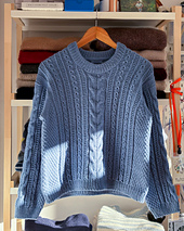 The Gwynver Sweater is a modified drop shoulder sweater worked top-down, both flat and in the round. The pattern features a simple and elegant cable motif down the centre of the front, back, and sleeves, which is framed by double moss stitch. The collar is made distinct from the body sections by a lateral braid.