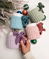 This pattern works up quickly and is perfect for using up leftover yarn from your stash. The cozy is designed to comfortably fit most standard mugs and includes a chain loop closure that can be fastened with a button or looped over the bow embellishment. A simple bow detail adds a charming finish and ties into current decor trends.