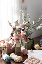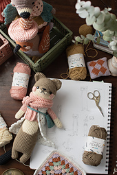 For the body of the stoat, we use two strands of Rainbow 8/4 Glitter Gold crocheted together. Owen Stoat also has 2 accessories: a vest and a scarf.