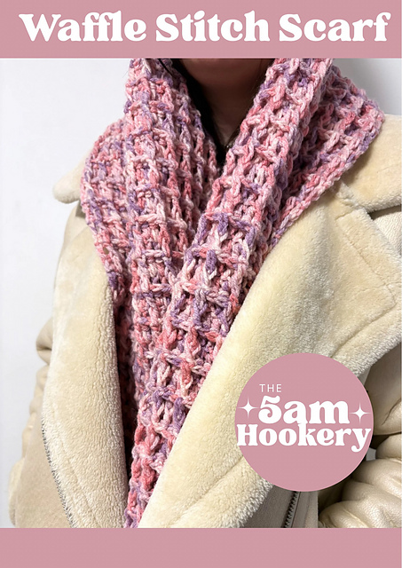 A super cosy waffle stitch scarf using so crafty Aldi rainbow yarn in pink.