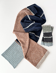 The combination of stitch patterns and generous stockinette stitch sections, along with a sporty long ribbing, gives this scarf a sophisticated yet casual look.