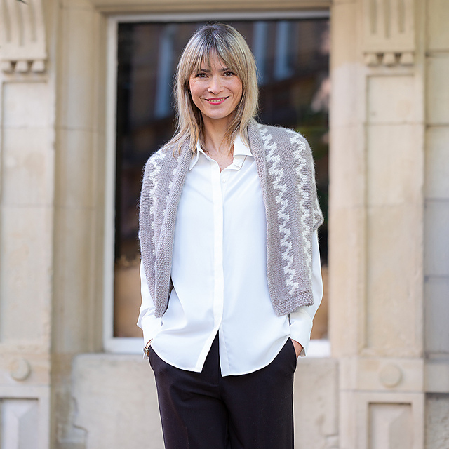 The ZIGZAG CAPE bolero with colourwork stripes in a Norwegian motif is worked back and forth in rows. You begin with a shawl collar in seed stitch, which later continues as an edging around the entire garment. To shape the armholes, stitches are placed on hold at the sides and bound off on both edges. The back section is worked in the Norwegian stripe pattern and finished with a final edging. By sewing the held stitches to the lower side edges of the bolero, the armholes are closed.