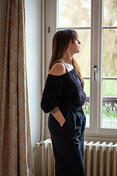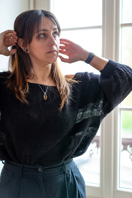 **C2 :** KMS par Yarn By Simone (72% Kid Mohair, 28% soie, 420 m pour 50g), coloris “only black”.