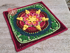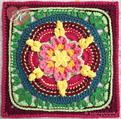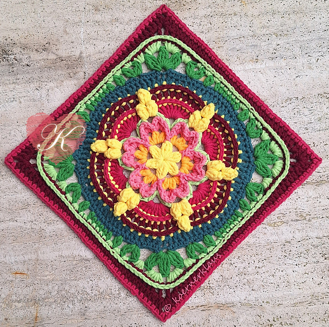 I made my square with dk yarn and crochet hook size 4.5mm. My finished square measures 11“ after blocking.