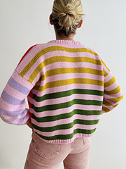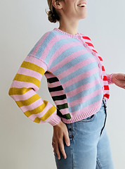 The cardigan is worked top down in one piece: First, the back part is worked back and forth in rows in stockinette stitch and with statement stripes in 2 different contrast colours. There are a bunch of increases to shape the armholes, then the back part is finished off without any increases and the hem is worked in 1x1 twisted ribbing. The front is worked afterwards. For the right front part, pick up stitches along the back part, work in stockinette stitch and in statement stripes with increases to shape the round neck and the armholes. Then, finish the right front part in stockinette stitch and in statement stripes without any increases – but before working the hem, put the stitches on hold on another rope/leftover yarn. Then, work the left front part the same way you have worked the right front part before with the only difference, that the statement stripes are placed offset from each other and that the increases for the round neck and the armholes are mirrored. As soon as you have worked the last statement stripe, pick up the stitches of the right front part as well as the back part. Now work the hem for the left and the right front part and the back part in the main colour in 1x1 ribbing with twisted stitches. Close the side seams of the cardigan with the mattress stitch.Then, pick up stitches along the armholes and work the sleeves in two different contrast colours in stockinette stitch in the round.Before working the cuffs in 1x1 ribbing with twisted stitches, work in a bunch of decreases for a balloon like shape. Last, but not least, the double folded collar in 1x1 ribbing with twisted stitches is added to the round neck and the button band (and if you like the knitted buttons) is worked to finish off the unique look of the cardigan. The fit of the design is oversized and boxy. The sleeves are relatively wide and the length of the cardigan is relatively short. The eye-catching statement stripes pattern creates a cool look leaving room for many creative ways to interpret the design.It's very easy to modify the cardigan to turn it into a sweater. The instructions how to modify the cardigan pattern to turn it into a sweater are included in the pattern (grey-green instructions).