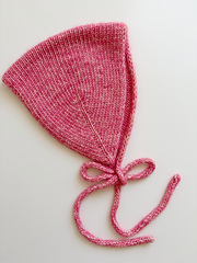 The Lucia Bonnet is worked flat. It begins with an i-cord to form the ties; then the increases are worked. Once the desired width is reached, continue in stockinette stitch. Finally, the decreases are worked and the piece is finished with an i-cord to form the other tie.