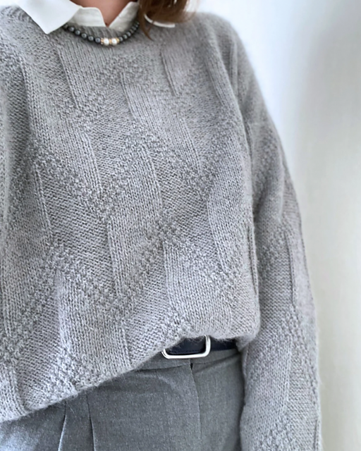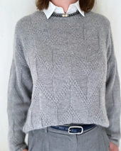 The sample pullover was knit using Sandnes Garn Alpakka Silke - 1042 grey mottled held together with Lana Grossa Setasuri - 19 light grey.