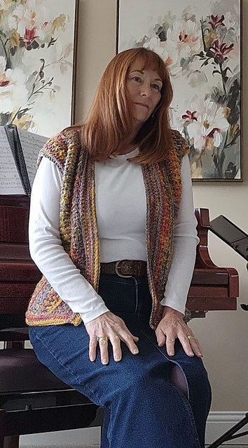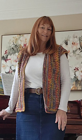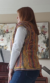 **Construction:** The vest is constructed by making two identical panels, which are then seamed together to form the main body. An added border along the bottom edge and neckline ties it all together. The stitch pattern is engaging and rhythmic, offering enough variation to keep experienced makers interested while remaining approachable and relaxing to work.