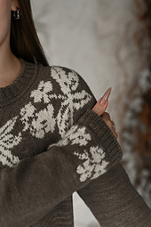 The circular yoke features a stranded colorwork pattern composed of fantasy flower motifs inspired by traditional Ukrainian embroidery, which are repeated in kind in the lower part of the sleeve. No intarsia work is involved.