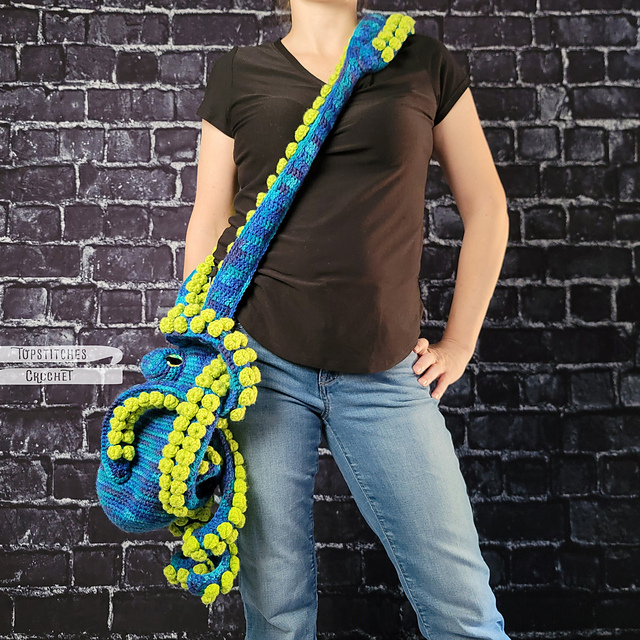 There are two versions contained within this pattern: the standard Octo-Purse with maximum suckers and a single crochet base bag. The "Lite" version of the pattern has half the amount of suckers and a double crochet base bag. There are also two different strap length options for EACH version of the purse.