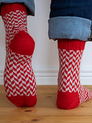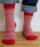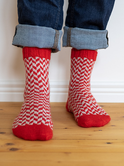 The sample pair was knitted in Filcolana Arwetta (80% superwash wool and 20% nylon, 210 m / 230 yds / 50 g), colorways 138 Geranium red and 977 Marzipan (melange)