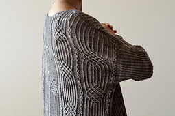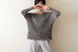 First, two I-cords are knit and stitches are picked up for the back and front along the I-cord edges. German short rows are used to shape the shoulders in 1x2 twisted rib, then the front and back of the pullover are worked back and forth separately to the underarm with smoking pattern. They are then joined and worked in the round in one piece to the hem. The sleeves are worked top down in the round in 1x2 twisted rib, and the cuffs are worked in 1x1 twisted rib. The body and sleeves feature a lateral braid as an accent.