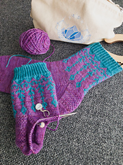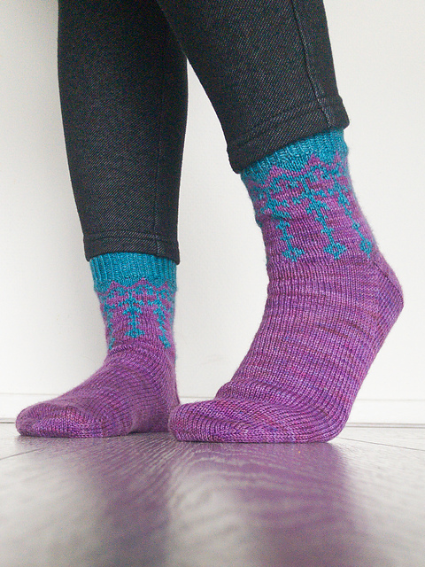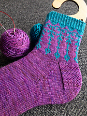 The sample is knitted using the Gem Cavern Sockset by ByNel Yarns.