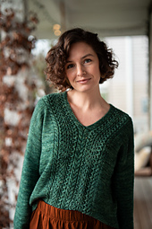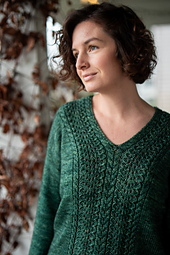 This seamless top down sweater begins at the shoulders with short row shaping to form the V neckline. The lace and cable panels are integrated into both the front and back and flow cleanly from the shoulder join into the body.