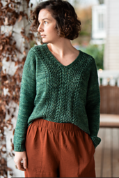 Soft Current Sweater is a DK weight sweater with a little bit of everything we love: clean finishings, purposeful shaping, and knitting that stays engaging. The lace and cable panels sweep over the shoulders and continue down the front and back, with short rows shaping that gives the V neckline its signature smooth, flattering line.