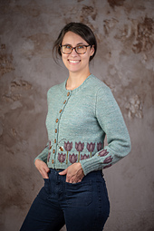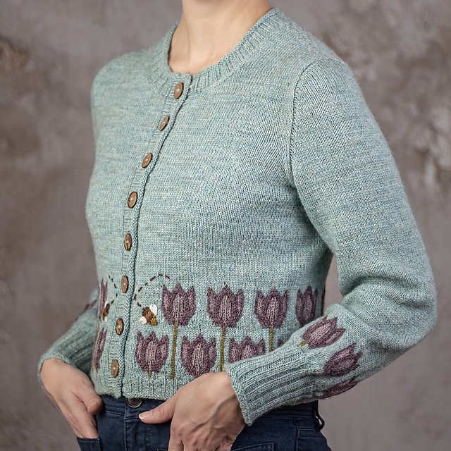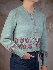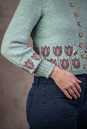 The body is knit straight until cable colorwork is worked to create the tulip motif, which ends around the high hip. Sleeves are worked from the top down using German Short Rows. Around the mid forearm, the tulip motif is worked again, followed by sharp decreases to a fitted 4” (10.2cm) cuff.