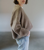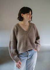 The Roomy V-Neck is a top-down sweater featuring an oversized, boxy silhouette with dropped shoulders and a deep V-neck. The back yoke is shaped using German short rows for an improved fit, then stitches are picked up and the shoulders are knit while shaping the neckline. The front and back are joined and the body is worked in the round, with sleeves picked up and knit from the armholes. Designed with exaggerated proportions, this piece is perfect for effortless layering over a classic tee.