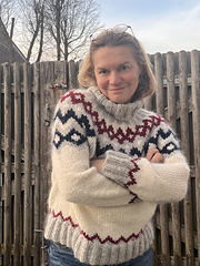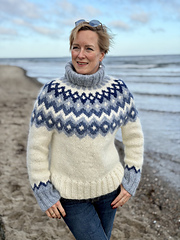 turtleneck is worked at the end from stitches that are picked up and knitted along the neck opening. It can be adjusted in length. The pattern of the Icelandic jumper is knitted according to a chart. A few rounds are knitted in three colors. As the jumper is knitted top down, the length of the body and sleeves can be easily adjusted and