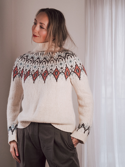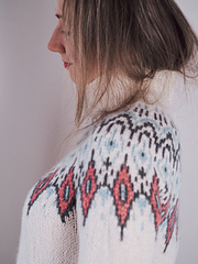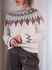 **Construction notes:** The Cholita sweater is a round yoke colorwork pullover, which is knit seamlessly top-down. First the neck is cast on and formed using Short Rows. After completing the yoke, the sleeves are separated from the body and finished with colorwork around the wrist and twisted ribbing. Around the garment, a repeating graphic colorwork pattern that reflects abstract mountains and valleys is worked.