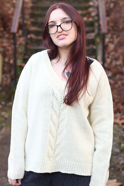 Sur le devant, une large torsade asymétrique capte la lumière et apporte une touche d’originalité à ce pull cosy, jouant entre modernité et tradition.