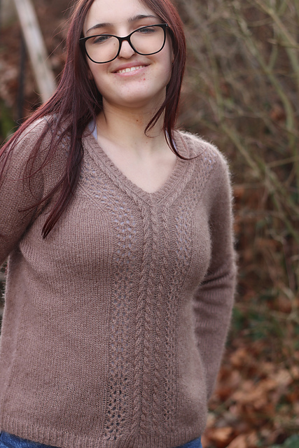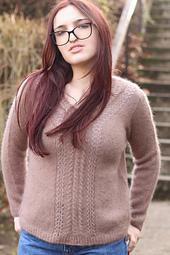 Its V-neckline is highlighted by a cable motif that flows downward and meets at the front, creating a refined and timeless silhouette.