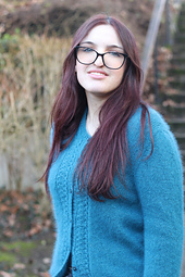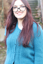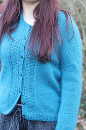 The sleeves are worked at the same time as the body, and the rounded neckline, framed by delicate lace on either side of the button band, gives the piece a timeless, graceful femininity.